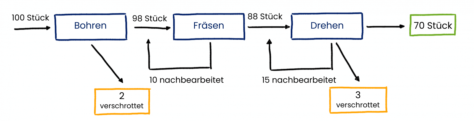 Du bist fest entschlossen, 1000 schöne Plätzchen für den örtlichen Weihnachtsmarkt herzustellen. Sie müssen wirklich schön aussehen. Leider ist jeder 20. Keks nicht zu gebrauchen, nur ein Haufen Krümel. Sie müssen sofort gegessen (vernichtet!) werden. Von dem, was übrig bleibt, kann jeder 10. Keks mit Schokoladenverzierungen gerettet werden (wir betrachten dies als Nacharbeit). Dein First Pass Yield misst, wie viele Kekse auf Anhieb in Ordnung sind. Gleichzeitig zeigt er an, wie viel Mehraufwand Du hast, weil der Teig nicht gut ist.