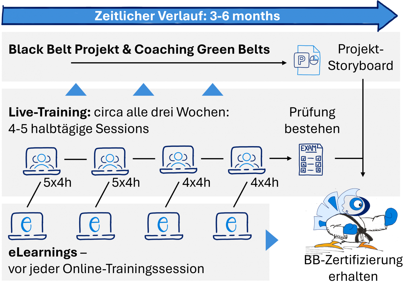 In unserem Black Belt Training unterstützen wir Sie dabei, Ihre persönlichen Stärken weiter zu entwickeln. Unsere erfahrenen Trainer werden sich mit Leidenschaft um Ihre individuelle Weiterentwicklung kümmern. Wir berücksichtigen Ihre Erfahrungen durch Schulungen in kleinen Gruppen und helfen Ihnen, Ihre Effektivität zu steigern. Black Belts werden die Unternehmenskultur dazu bringen, auf der Grundlage von Daten und Fakten zu arbeiten und zu verwalten.