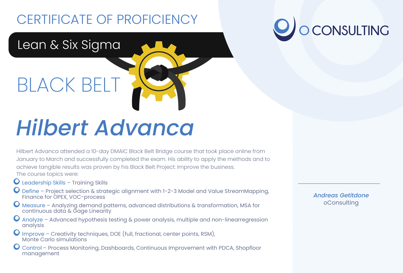 Zertifizierung durch oConsulting nach ISO 18404 und ISO 13053sind die erste Anlaufstelle der Organisation, wenn es darum geht, Verbesserungen voranzutreiben und große Transformationsprojekte zu leiten.