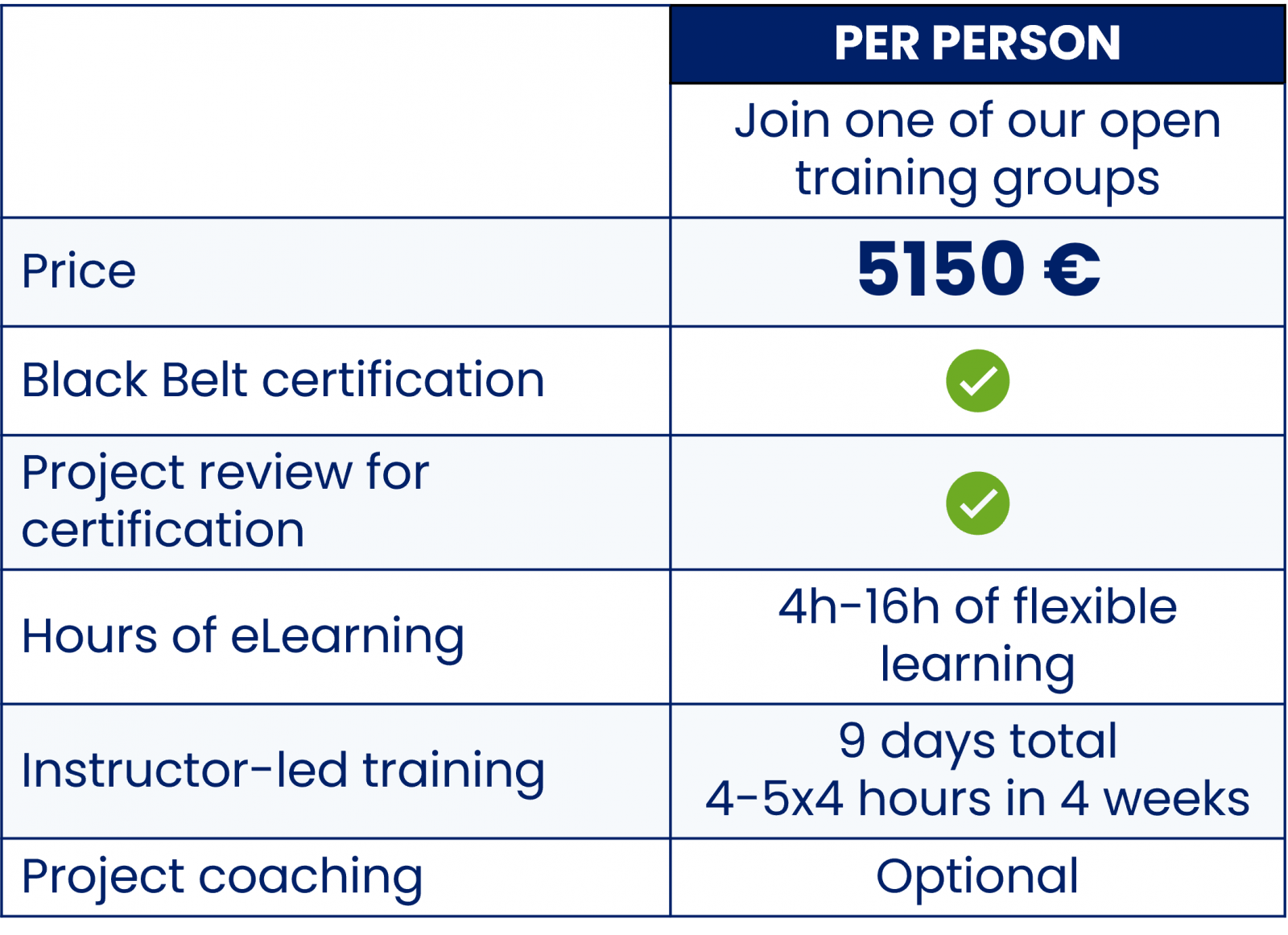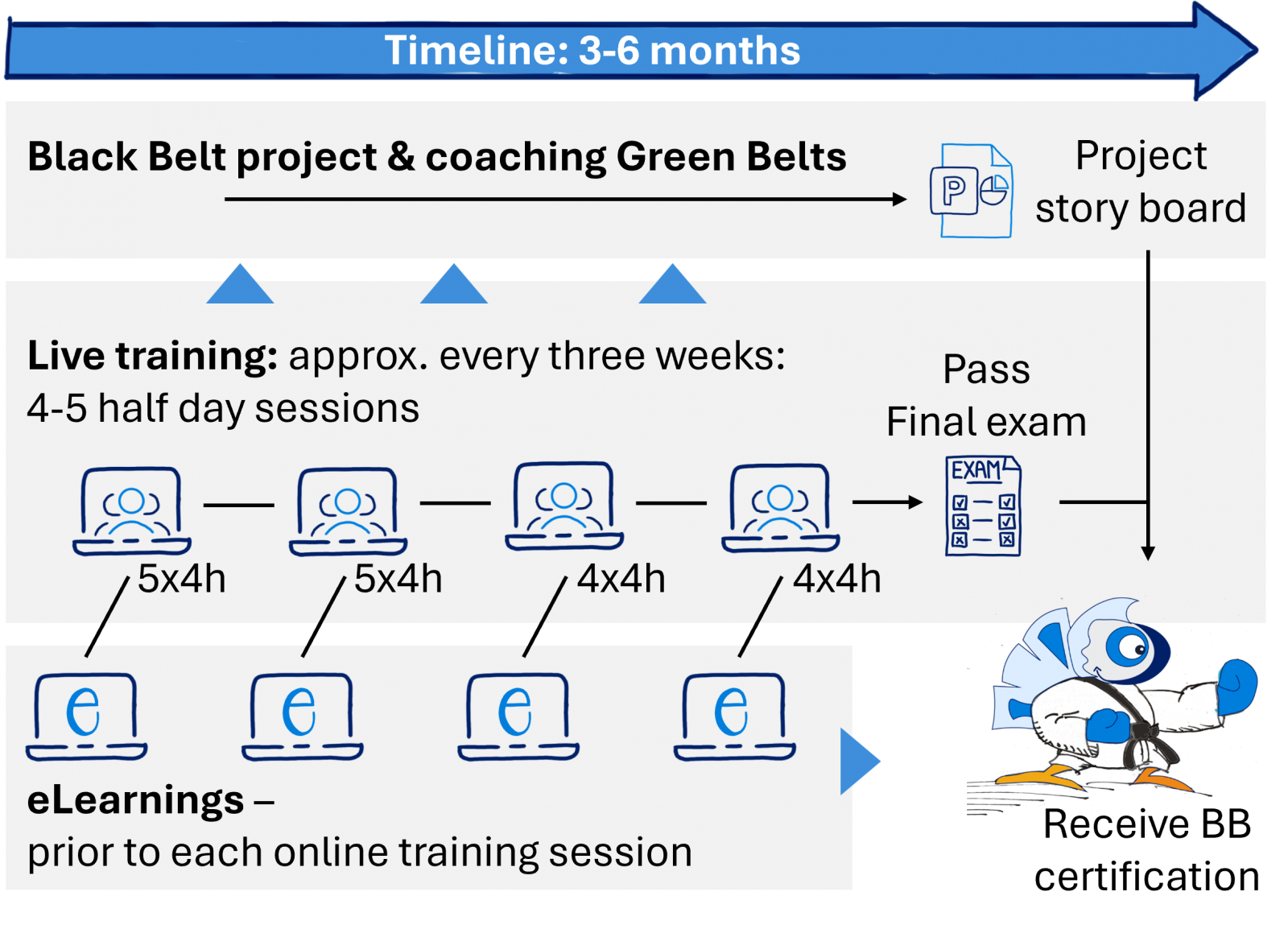 In the last 20 years we have experienced that Black Belts benefit so much from having a good coach at hand. After the Black Belt has learned about so many new methods the coach will help him to practically work according to the new approach.